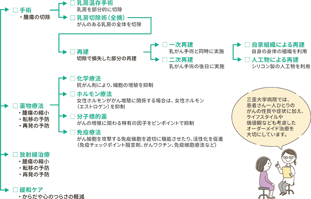 乳がんの広がりや場所、患者さんの体質やご希望によって、手術方法は一人ひとり異なります。
