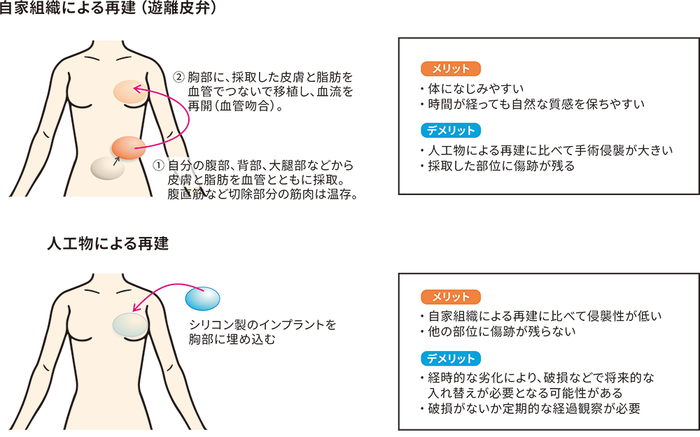自家組織による再建のメリットとしては、体になじみやすいという点と時間がたっても自然な質感を保ちやすい点があげられます。しかし、人工物による再建に比べて手術侵襲が大きくなる点と、採取した部位に傷跡が残る点がデメリットとして考えられます。