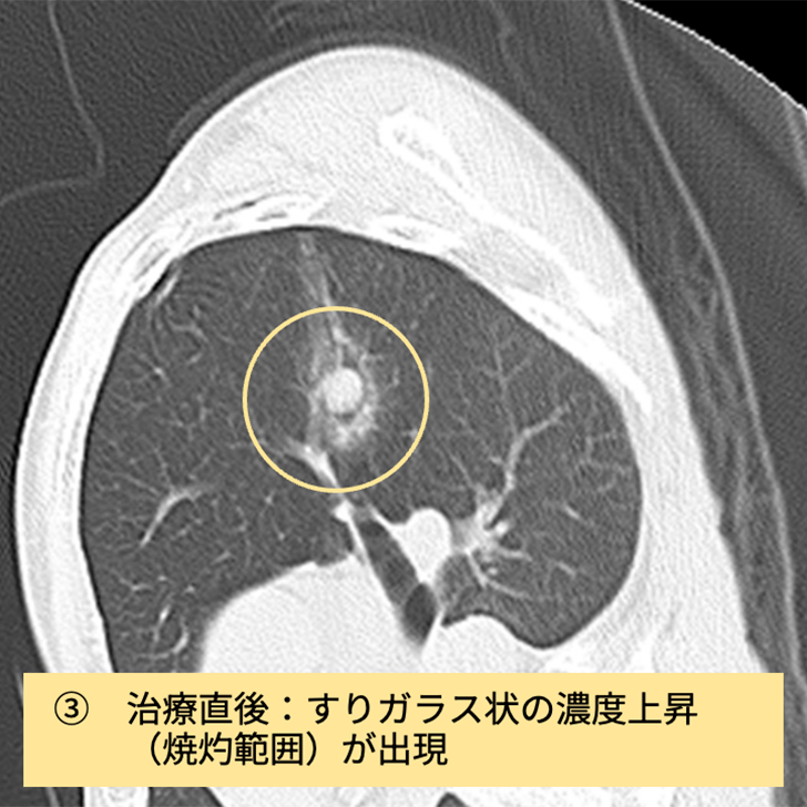焼灼は、腫瘍とその周り数mm程度の安全域を含む部分が範囲となります。例えば1cmの腫瘍を治療する場合には2cm程度を焼灼します(図1③)。安全域が少ないと腫瘍細胞が遺残し、再発のリスクとなります。